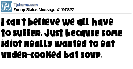 X is I can't believe we all have to suffer, just because some idiot really wanted to eat under-cooked bat soup.