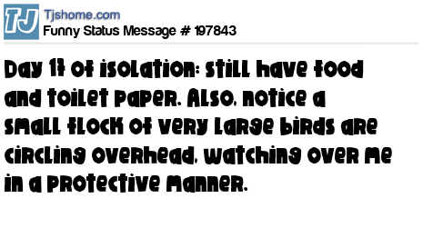 X says Day 17 of isolation: still have food and toilet paper. Also, notice a small flock of very large birds are circling overhead, watching over me in a protective manner.