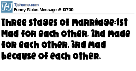 X is Three stages of marriage:1st Mad for each other, 2nd made for each other, 3rd mad because of each other.
