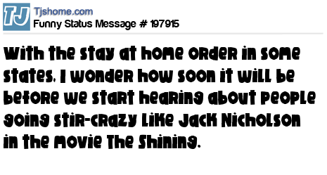 X is With the stay at home order in some states, I wonder how soon it will be before we start hearing about people going stir-crazy like Jack Nicholson in the movie The Shining.