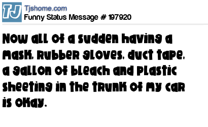 X is Now all of a sudden having a mask, rubber gloves, duct tape, a gallon of bleach and plastic sheeting in the trunk of my car is okay.