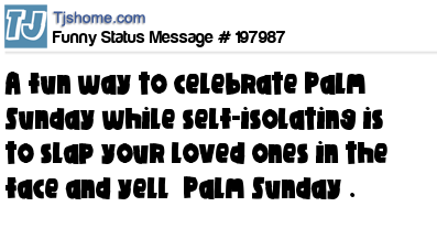 X says A fun way to celebrate Palm Sunday while self-isolating is to slap your loved ones in the face and yell “Palm Sunday”.