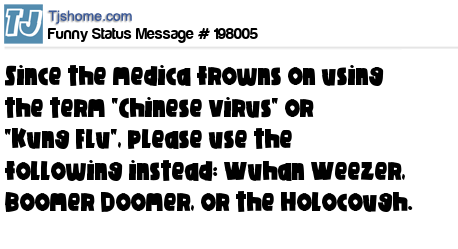 X Since the medica frowns on using the term "Chinese virus" or "Kung Flu", please use the following instead: Wuhan Weezer, Boomer Doomer, or the Holocough.
