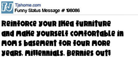 X says Reinforce your Ikea furniture and make yourself comfortable in mom’s basement for four more years, mi!!ennials. Bernies out!