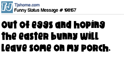 X is Out of eggs and hoping the easter bunny will leave some on my porch.