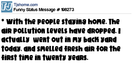 X is * With the people staying home. The air pollution levels have dropped. I actually went out in my back yard today, and smelled fresh air for the first time in twenty years.