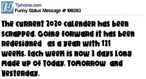 X says The current 2020 calender has been scrapped. Going forward it has been redesigned as a year with 121 weeks. Each week is now 3 days long made up of Today, Tomorrow and Yesterday.
