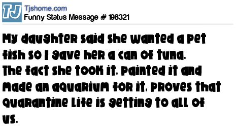X says My daughter said she wanted a pet fish so I gave her a can of tuna. The fact she took it, painted it and made an aquarium for it, proves that quarantine life is getting to all of us.