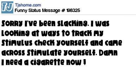 X says Sorry I've been slacking. I was looking at ways to track my Stimulus check yourself and came across Stimulate yourself. Damn I need a cigarette now !