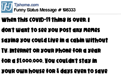 X says When this COVID-19 thing is over, I don't want to see you post any memes saying you could live in a cabin without TV, Internet or your phone for a year for a $1,000,000. You couldn't stay in your own house for 5 days even to save your grandmother.