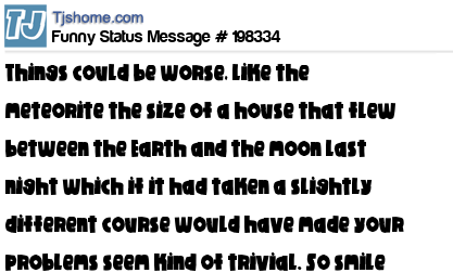 X is Things could be worse, like the meteorite the size of a house that flew between the Earth and the moon last night which if it had taken a slightly different course would have made your problems seem kind of trivial. So smile and be happy!