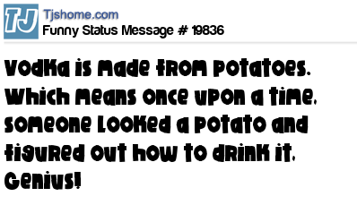 - # 81001 Motivated Idiot: Just found out Vodka is made from potatoes.... Which means once upon a time, someone looked at a potato and figured out how to drink it, Genius! I'm currently looking at this carrot, any minute now I'll be a genius.......