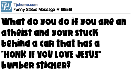 - # 188794 What if you are an atheist, and you're stuck behind a guy with a "Honk if You Love Jesus" bumper sticker at a traffic light?