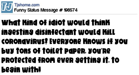 X says What kind of idiot would think ingesting disinfectant would kill coronavirus? Everyone knows if you buy tons of toilet paper, you're protected from ever getting it, to begin with!