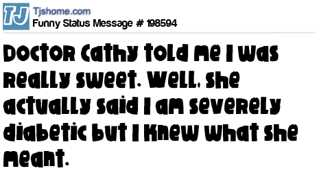 - # 198571 My female doctor told me I'm really sweet. Well, she actually said I am severely diabetic but I knew what she meant.