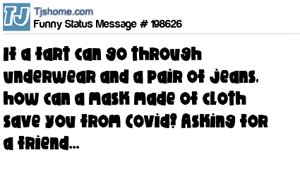 - # 198531 If a fart can get through underwear and a pair of jeans how can a mask made of cloth protect you from Corona?