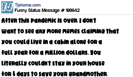 - # 198333 When this COVID-19 thing is over, I don't want to see you post any memes saying you could live in a cabin without TV, Internet or your phone for a year for a $1,000,000. You couldn't stay in your own house for 5 days even to save your grandmother.