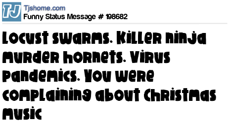 X says Locust swarms. Killer ninja murder hornets. Virus pandemics. You were complaining about Christmas music