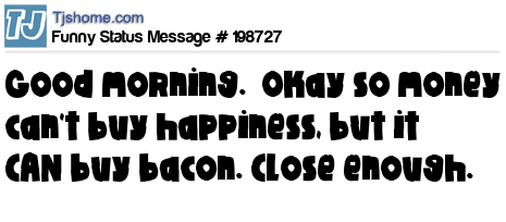 X says Good morning. Okay so money can't buy happiness, but it CAN buy bacon. Close enough.