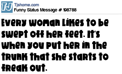 - # 185186 every girl like to be swept of her feet,.... its when you put her in the trunk that she freaks out.