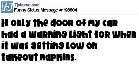 X says If only the door of my car had a warning light for when it was getting low on takeout napkins.