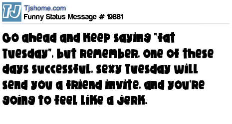 X Go ahead and keep saying "fat Tuesday", but remember, one of these days successful, sexy Tuesday will send you a friend invite, and you're going to feel like a jerk.