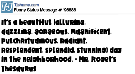 X says It's a beautiful (alluring, dazzling, gorgeous, magnificent, pulchritudinous, radiant, resplendent, splendid, stunning) day in the neighborhood. - Mr. Roget's Thesaurus