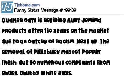 X says Quaker Oats is retiring Aunt Jemima products after 130 years on the market due to an outcry of racism. Next up: The removal of Pillsbury mascot Poppin' Fresh, due to numerous complaints from short, chubby white guys.