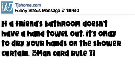 X says If a friend's bathroom doesn't have a hand towel out, it's okay to dry your hands on the shower curtain. ~Man card rule 23