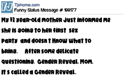 - # 199143 My 72 year-old mother just informed me she is going to her first “sex party” and doesn’t know what to bring. After some delicate questioning, “Gender Reveal, Mom. It’s called a Gender Reveal.”