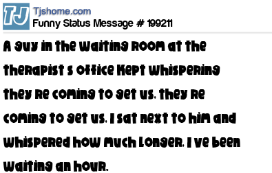 X says A guy in the waiting room at the therapist’s office kept whispering they’re coming to get us, they’re coming to get us, I sat next to him and whispered how much longer, I’ve been waiting an hour.