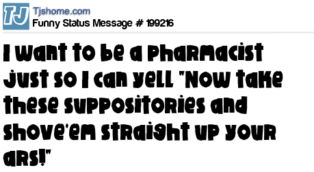 - # 57107 I want to be a pharmacist. Just so I can yell "Now take your suppositories and shove'em straight up your a$$!"
