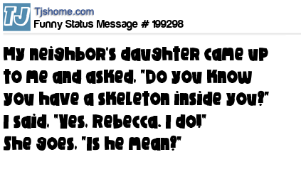X says My neighbor's daughter came up to me and asked, "Do you know you have a skeleton inside you?" I said, "Yes, Rebecca. I do!" She goes, "Is he mean?"