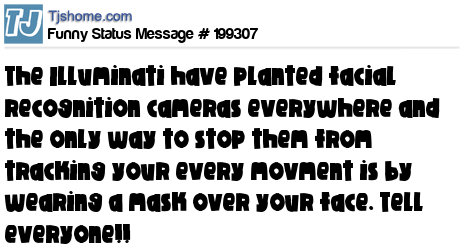 X is The Illuminati have planted facial recognition cameras everywhere and the only way to stop them from tracking your every movment is by wearing a mask over your face. Tell everyone!!