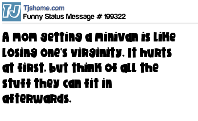 X says A mom getting a minivan is like losing one's virginity. It hurts at first, but think of all the stuff they can fit in afterwards.