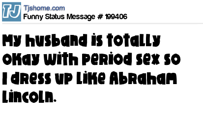 X says My husband is totally okay with period sex so I dress up like Abraham Lincoln.