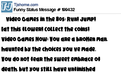X says Video Games in the 80s: Run! Jump! Eat this flower! Collect the coins! Video Games Now: You are a broken man, haunted by the choices you’ve made. You do not fear the sweet embrace of death, but you still have unfinished business.