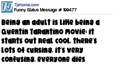 X says Being an adult is like being a Quentin Tarantino movie: it starts out real cool, there's lots of cursing, it's very confusing, everyone dies