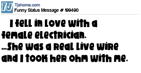 X says I fell in love with a female electrician. …She was a real live wire and I took her ohm with me.