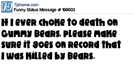 - # 193041 If I ever choke to death eating these gummy bears will one of you please do me a favor and just post on my wall "He was killed by bears!" and just leave it at that.