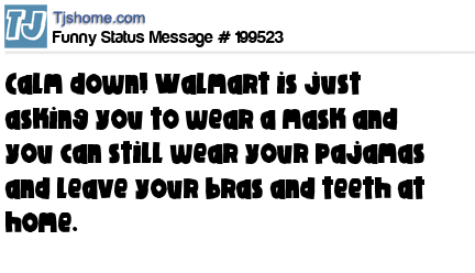 X is Calm down! Walmart is just asking you to wear a mask and you can still wear your pajamas and leave your bras and teeth at home.