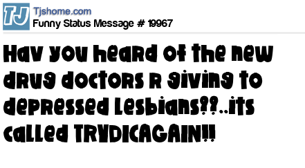 - # 32125 Scientists have revealed today that they have found a new drug for depressed lesbians.... it`s called "TRYDIXAGAIN