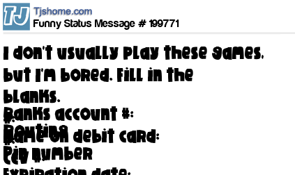 - # 162574 ***LATEST SOCIAL MEDIA GAME~~~ Inbox me your Bank Account or Credit Card number (be sure to give me the expiration date and 3 digit security code) and I will post in my status which bill or Christmas gift I used it for. Let's play!!!