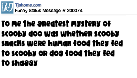 X says To me the greatest mystery of scooby doo was whether scooby snacks were human food they fed to scooby or dog food they fed to shaggy