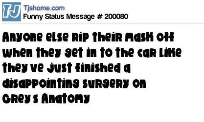 - # 207433 Anyone else rip their mask off when they get in the car like they've just finished a disappointing surgery on Grey's Anatomy?