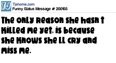 X says The only reason she hasn’t killed me yet, is because she knows she’ll cry and miss me.