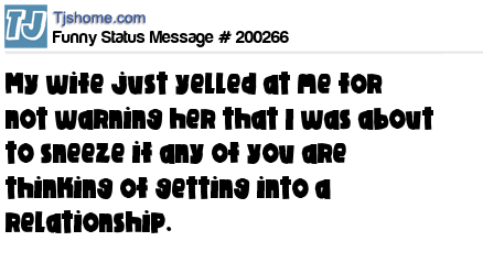 X says My wife just yelled at me for not warning her that I was about to sneeze if any of you are thinking of getting into a relationship.