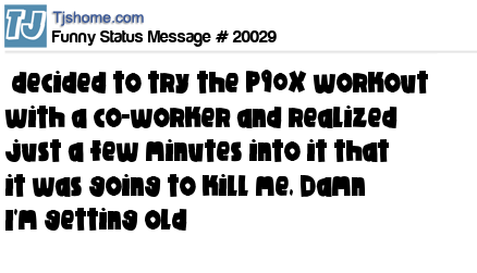 X is decided to try the P90X workout with a co-worker and realized just a few minutes into it that it was going to kill me, Damn I'm getting old