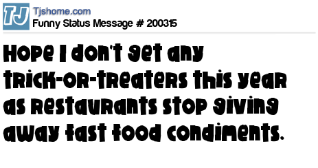- # 197866 Just remembered that it's Halloween and won't be getting any trick-or-treaters this year, which is all good as I might need my fast food condiments to help survive the Coronavirus.