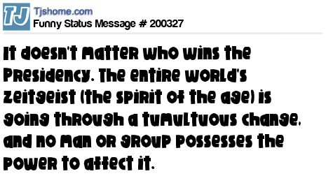 X says It doesn't matter who wins the Presidency. The entire world's zeitgeist (the spirit of the age) is going through a tumultuous change, and no man or group possesses the power to affect it.